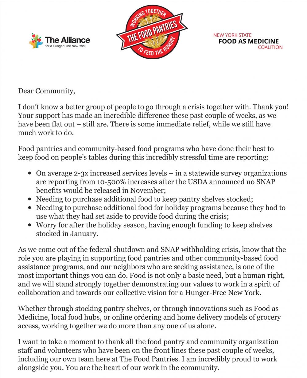 Support our 70 pantries with a monetary gift here. Other ways to give, IRA, DAF, Private Foundation, Stock, Legacy Gifts, Corporate Sponsorships and Grants. Contact us at pantries@thefoodpantries.org, for questions or further conversation. Checks should be made payable to The Food Pantries for the Capital District and sent to 32 Essex St., Albany, NY 12206.
