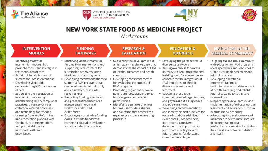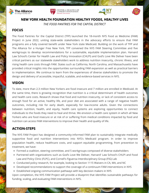 The New York State Food as Medicine (FAM) Project was launched in June of 2022. The Food Pantries is coordinating the effort to institutionalize funding for FAM programs into NYS Medicaid. This project is funded by the New York Health Foundation and is in partnership with the Center for Health Law and Policy Innovation (CHLPI) of Harvard Law School. Below is a summary of the 18-month project as well as more information about the collective planning efforts.